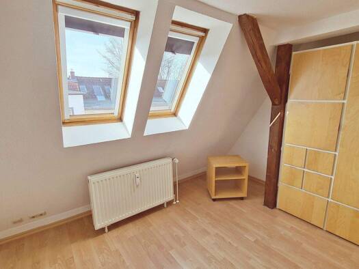 Diese kleine 2-Zimmer-Wohnung liegt direkt unterm Dach und ist ideal für Singles geeignet. Die Wohnung ist ausgestattet mit einer einfachen Einbauküche sowie einem Wannenbad mit Fenster.