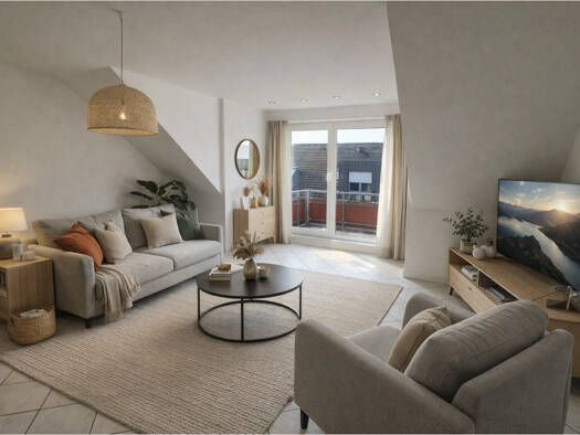Diese 2 Zimmer Dachgeschosswohnung mit ca. 64 m² bietet einen klar geschnittenen Grundriss und eine angenehme Trennung von Wohnen und Schlafen. Helle Räume, große Fensterflächen und der Balkon schaffen ein luftiges Wohngefühl und machen die Wohnung zu einer praktischen Basis für den Alltag. Eingangsbereich und Wohnbereich Nach dem Eintreten führt der Weg in den großzügigen Wohnbereich. Hier fällt sofort die breite Fensterfront mit Tür zum Balkon auf, die viel Tageslicht hereinlässt. Der Raum bi...