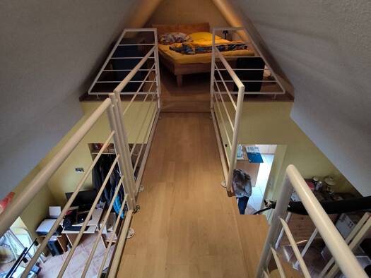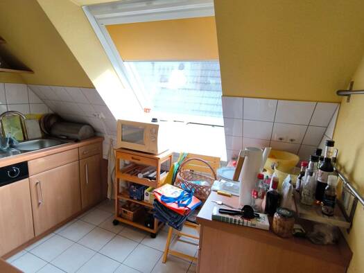 Die Wohnung befindet im Dachgeschoss eines 3 -Parteien - Hauses. Ein Stellplatz im Hof des Grundstücks gehört zum Mietangebot. Der beigefügte Grundriss wird durch Nutzflächen im Spitzbodenbereich ergänzt, die über eine Raumspar-Wendeltreppe erreicht werden. An der Wohnung direkt befindet sich kein Balkon jedoch kann der am Ende des Grundstücks gelegene Garten mit genutzt werden. Ein Kellerersatzraum befindet sich in einem gemauerten Nebengebäude auf dem Grundstück.