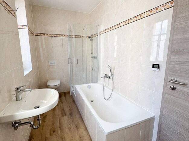 Das Mehrfamilienhaus wurde 1996 grundsaniert, verfügt über zwei Eingänge mit jeweils 8 Wohneinheiten. Die Heizung wurde 2021 erneuert. Die Wohnung befindet sich im 1. Obergeschoss des Objektes und ve...