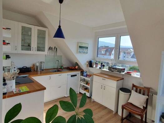 Kurzbeschreibung HD-Ziegelhs: fast ein Penthouse, 3 ZKB mit Blick über das Tal, 2 Balkone Objekt Innen-Video link: Wohnzimmer: 29m², Parkett, Zugang zum SW-Balkon 17m², mit Schlafzimmer: 19m², Zugang zum NO-Balkon 5m² Kinder-Zimmer: 12m² gleichfalls Zugang kleiner Balkon Küche: 10m², mit Einbauküche, Zugang großer Balkon Bad: 10m², Wanne, Dusche, 2 Wachbecken, WC, Fenster, WM- Anschluß Gäste-WC Diele: 11m² Keller neben Hauseingang 1 TG-Platz 60EUR Gas Zentral-Heizung KEIN Fahrstuhl Waschmaschin...