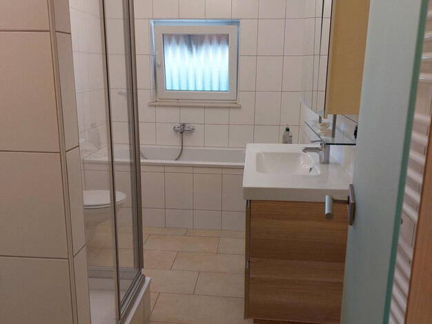 Objektbeschreibung Die helle und sehr gut geschnittene 3 Zimmer Wohnung mit ca. 76,5 m² Wohnfläche liegt im 1.OG eines gepflegten 2 Fam. Hauses in sehr ruhiger Siedlungslage. - Balkon - Bad mit Fenster - SAT Anlage - Kunststofffenster mit Rollos Die Wohnung wird nur an 1 Person oder Paar mittleren Alters ohne Haustiere vermietet. Bei Bedarf kann eine Einzelgarage angemietet werden. Raumaufteilung Großes Wohn- Esszimmer mit Laminat und Zugang zum gefliesten Balkon mit Blick ins Grüne, auf dem ma...