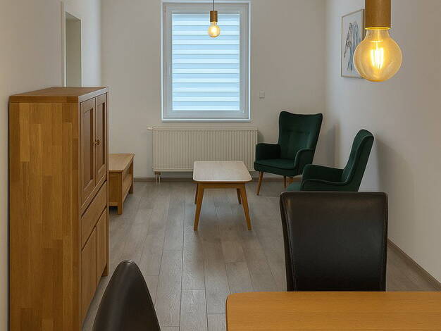 Renovierte 3-Zimmer-Wohnung in 1. Obergeschoss. Die Wohnung hat eine neue elektrische Anlage und Leitungen, neue Lichtschalter und Steckdosen bekommen. Die Wände sind in allen Räumen weiß gestrichen. Die Wohnräume und die Küche sind mit Holzdielen verlegt. Zusätzlich erhalten Sie ein komplett neues Badezimmer mit Dusche und modernen Fliesen. Der Waschmaschinenanschluss befindet sich in der Küche.