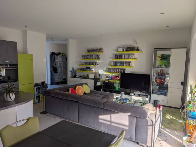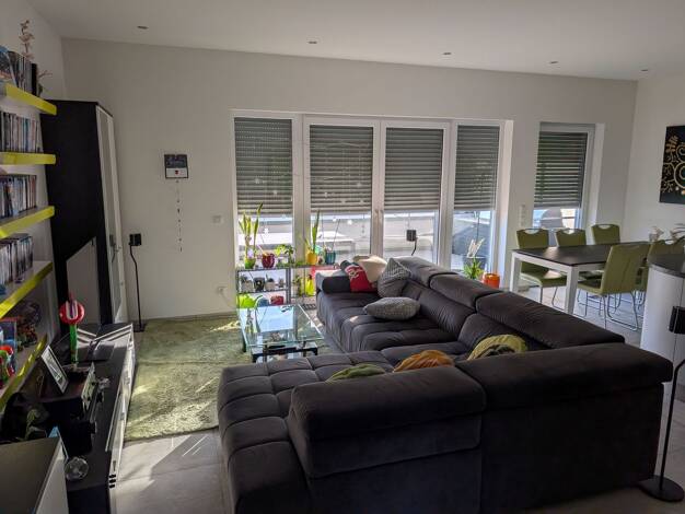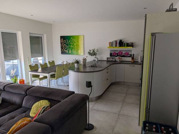 Im Obergeschoss des Hauses befindet sich eine schicke, großzügige 3,5-Zimmerwohnung. Die Wohnung besteht aus einem geräumigen Wohnzimmer, einer großen Küche mit Platz für einen Esstisch, einem Elternschlafzimmer mit eigenem Bad und Ankleidezimmer, einem Kinderzimmer zur Gartenseite, einem Gäste-WC sowie einem weiteren Badezimmer. Beide Bäder verfügen über Duschen mit flacher Duschtasse. Abweichend zum Grundriss ist in der Wohnung keine Badewanne verbaut. Edle Vinylböden in Holzoptik, verbunden ...