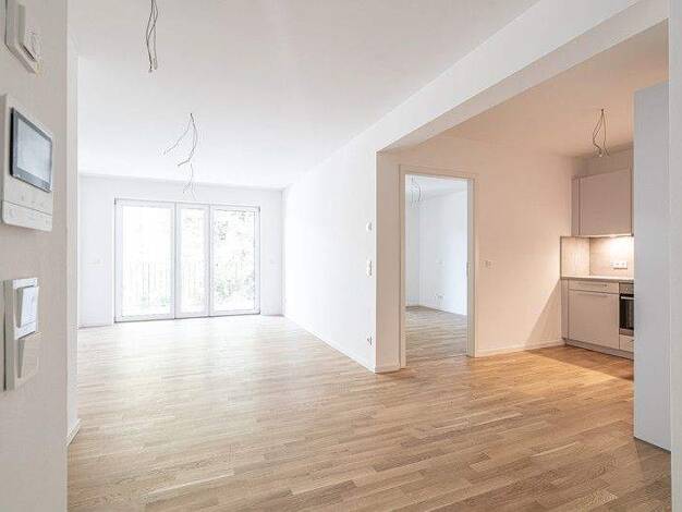 Diese helle 3-Zimmer-Neubau-Wohnung hat einiges zu bieten. Mit dem Aufzug kommen Sie bequem in den 1. Stock. Hier empfängt Sie Ihr neues Zuhause mit Parkettboden und weißen Wänden. Die Einbauküche lä...