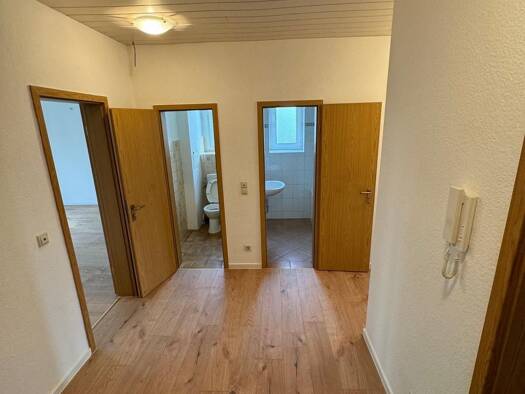 Diese 3 Raum-Wohnung befindet sich im 2. Obergeschoss eines Mehrfamilienhauses. Die Wohnung wurde frisch saniert und es befindet sich PVC_Planken auf den Fußböden. Alle Räume sind weiß gestrichen. Im...