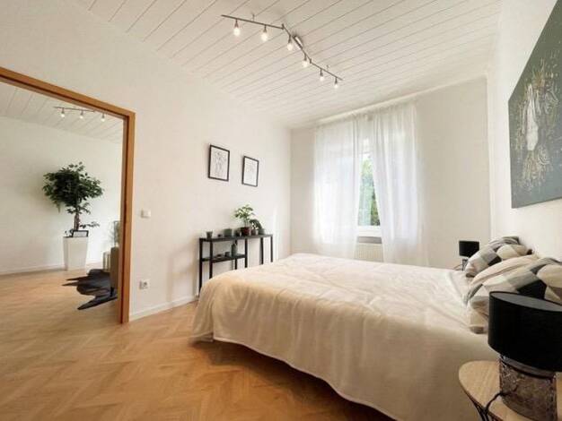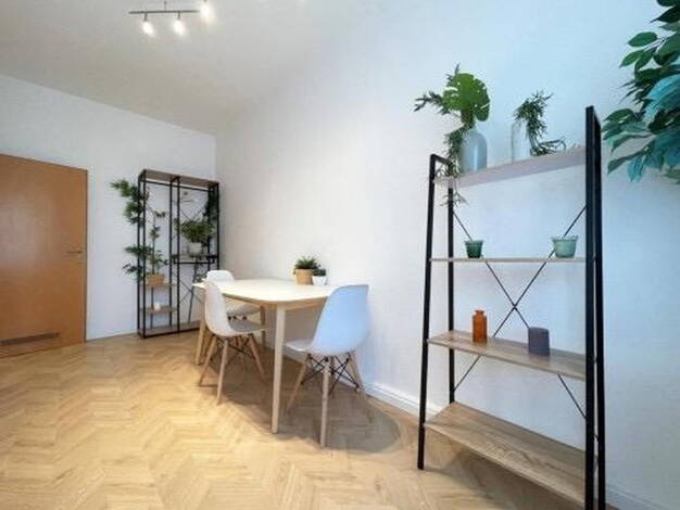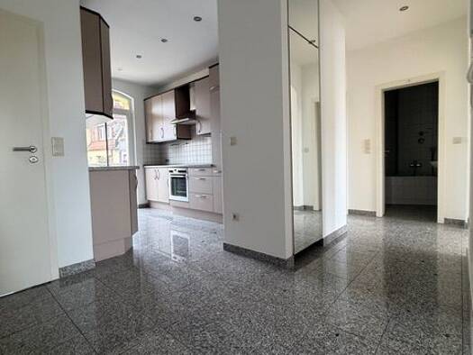 3-Zimmer (Schlaf-, Wohn- und drittes Zimmer), Küche, Bad, Flur, Kellerabteil. Die EBK kann vom Vormieter gegen Ablöse übernommen werden - VHB 2.400.- € EBK mit E-Herd, Dunstabzugshaube, Backofen, Spüle, Spülmaschine, Kühlschrank mit Gefrierfunktion, div. Ober- und Unterschränke, Waschmaschine