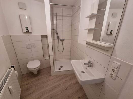 Insgesamt hat die Wohnung 3 Zimmer, Küche, Bad und Terrasse mit einer Wohnfläche von 96 qm^2. Das Badezimmer verfügt über eine große begehbare Dusche. Vom Ess-Wohnzimmer gelangt man direkt auf die gr...