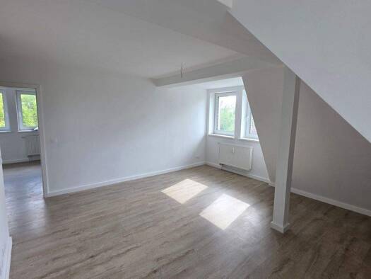 Sie sind auf der Suche nach einer schicken und bezahlbaren Dreiraumwohnung? Dann ist diese Immobilie genau die Richtige für Sie! Die Wohnung befindet sich im Dachgeschoss eines ruhigen und gepflegten Mehrfamilienhauses. Vom Flur aus gelangen Sie zum einen in das geräumige Bad, welches mit einer Wanne und einem Fenster ausgestattet ist, und zum anderen in den großzügigen Wohn-/Essbereich. Ein Paradies für Kinder ist der ausgebaute Dachboden, der über eine Treppe vom Flur aus erreichbar ist. Einz...
