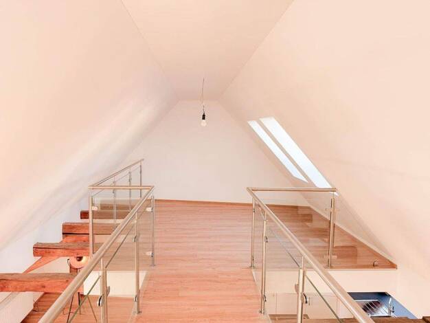 Helle Wohnung mit großzügigem Raumgefühl durch zahlreiche Gauben und Westbalkon (mit Zugang vom Schlafzimmer und Kochbereich). Moderne Ausstattung mit elektrischen Rolläden, Netzwerkanschluß in jedem...