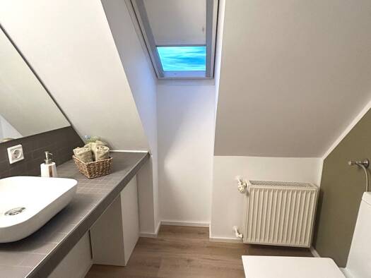 Die Wohnung befindet sich im 1. OG in einem Reihenhaus mit zwei Einheiten. Hinter der Wohnungstür öffnet sich ein großzügiger Wohn- und Essbereich. Von hier erreicht man das große Tageslichtbad mit D...