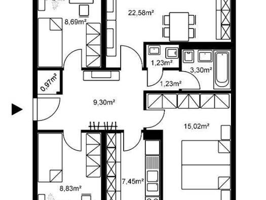 Beim Betreten der Wohnung gelangst du zunächst in den Eingangsbereich, der dich in einen zentralen Flur führt. Auf der linken Seite befindet sich das Badezimmer mit Dusche. Rechts vom Flur öffnet sic...