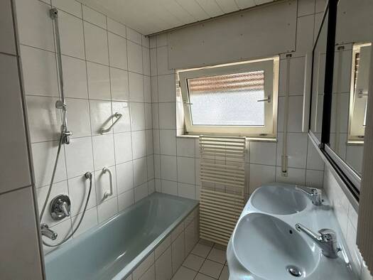 Beschreibung: Zur Vermietung steht eine großzügige 4-Zimmer-Wohnung mit ca. 112 m² im Obergeschoss eines gepflegten Zweifamilienhauses in Nauheim (Kreis Groß-Gerau). Die Wohnung liegt direkt am Schwarzbach, umgeben von viel Grün und in sehr ruhiger Lage. Besonders attraktiv sind der große Balkon sowie ein zusätzlicher kleiner Balkon, auf den alle drei Schlafzimmer direkten Zugang haben. Zusätzlich steht ein großer Abstellraum im Dachgeschoss zur Verfügung. Das Badezimmer ist großzügig, WC und B...