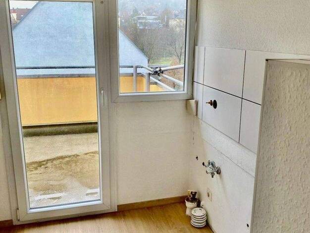 Helle 4 Zimmer Wohnung im 1. OG mit sonnigem Südbalkon. Ruhige Ortsrandlage in einer Sackgasse. Tageslichtbad mit 2 Waschbecken, Dusche und Badewanne, WC separat. ÖPNV Anschluss. Einkaufsmöglichkeiten in Laufnähe.