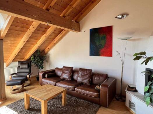 Diese hochwertig ausgestattete 4-Zimmer-Wohnung im Dachgeschoss überzeugt auf ca. 110 m² mit einem offenen Wohn- und Essbereich samt Sichtdachstuhl und gemütlichem Kamin. Von hier aus gelangen Sie direkt auf den großzügigen Balkon mit unverbaubarem Blick in die Natur. Die Wohnung verfügt über drei Schlafzimmer, darunter ein stilvolles Master-Schlafzimmer mit Einbauschränken, Altholzwand, Bad en suite sowie privater Sauna. Ein weiteres Badezimmer dient gleichzeitig als Gäste-WC und als Bad für d...