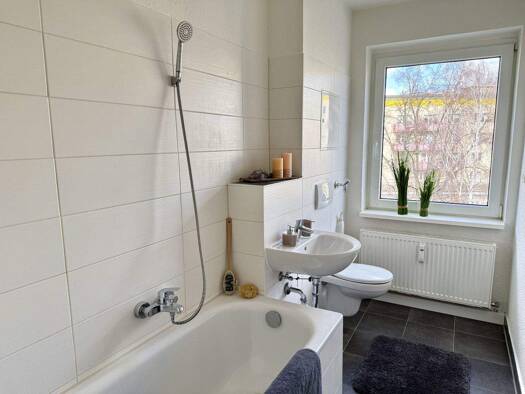 Diese 4-Raum-Wohnung ist aufgrund Ihrer Raumanzahl und Aufteilung optimal geeignet für Familien. Jedes Kind hat sein eigenes Reich und kann sich hier kreativ und spielerisch entfalten. Die Wege zur Schule, zum Kindergarten oder zu Einkaufsmöglichkeiten sind einfach erreichbar und sehr nahe gelegen. Die zentrale Lage ermöglicht eine schnelle Anbindung zum ÖPNV. Sowohl Bad als auch Küche sind mit einem Fenster und modernen großformatigen Fliesen ausgestattet. Die weißen Innentüren und die frische...