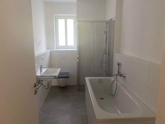 Alle Räumlichkeiten werden komplett mit Raufaser weiß versehen. Auf Grund der Größe der Küche kann diese als Wohnküche genutzt werden. Die Wohnung verfügt über ein Gästebad, die Bäder werden ebenso komplett saniert. In der Küche befindet sich im Arbeitsbereich ein Fliesenspiegel, wo sich auch der E-Herd-Anschluss befindet. Alle Bodenbeläge werden mit einer sehr modernen CV-Design Planke erneuert, die sehr pflegeleicht ist.