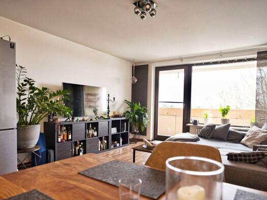 Diese helle 3 Zimmer Wohnung liegt in einer ruhigen Gegend in Augsburg Inningen. Das gemütliche Wohnzimmer mit großer Couch und TV-Gerät (Magenta TV) geht in den Essbereich über, der durch einen schö...