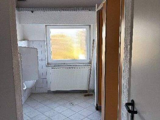 Die Wohnung befindet sich im ersten Obergeschoss eines Mehrfamilienhauses. Man betritt sie durch das Treppenhaus in den Flur. Rechter Hand ist das Badezimmer mit Wanne und Waschmaschinenstellplatz, d...