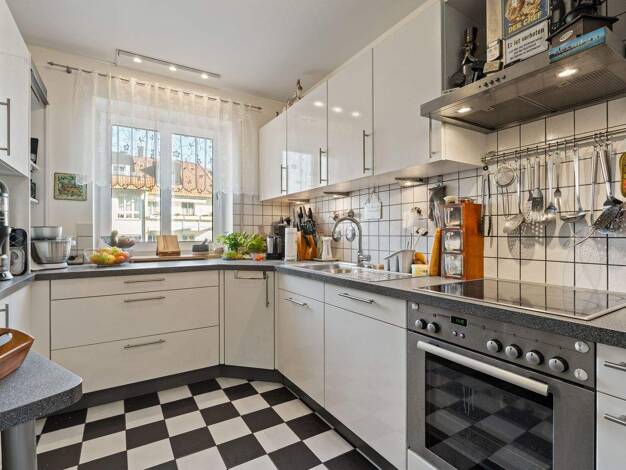 Die helle 3-Zimmer-Wohnung liegt im 3. Obergeschoss einer gepflegten Wohnanlage. Der Eingangsbereich verfügt über eine maßgefertigte Einbauschrankwand als Garderobe. Die Küche ist mit einer modernen ...