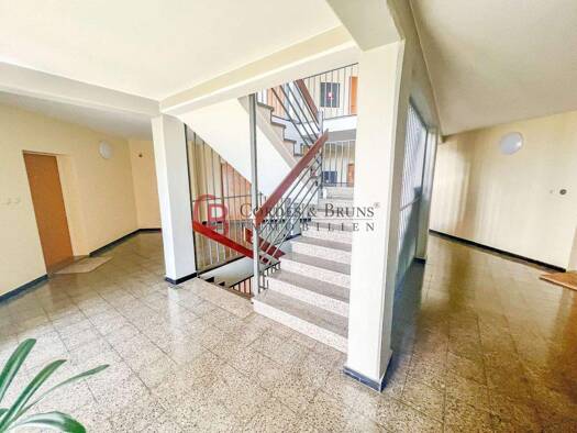Von dem Eingangsbereich mit Garderobe gelangen Sie in die Diele. Dort fällt der Blick auf den gut erhaltenen Terrazzo - Steinboden, die Treppe mit dem schnörkeligen Treppengeländer und auf die hohen,...