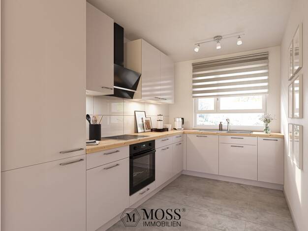 Rechts vom Eingangsbereich der Hauptwohnung befindet sich die helle Küche mit moderner Einbauküche und einem gemütlichen Essplatz. Eine Tür führt von hier direkt über eine Treppe in die Kellerräume u...