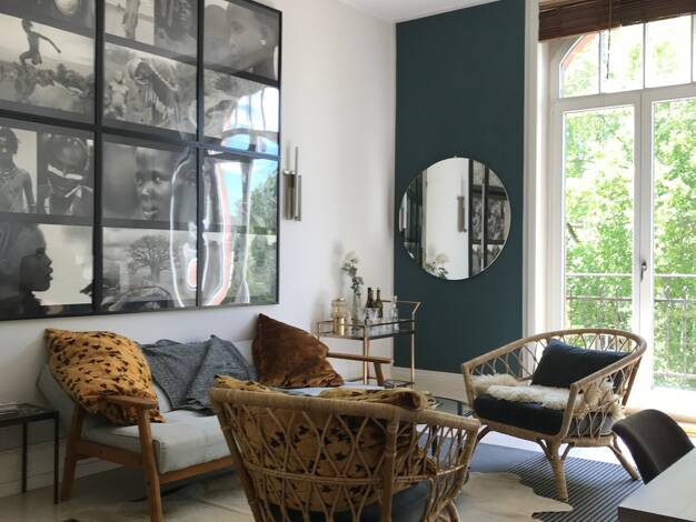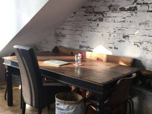 Gemütlich eingerichtete Dreizimmerwohnung über zwei Etagen in Bornheim.AusstattungWohnen: der Wohn- Essbereich ist mit mehreren Sesseln, großem Esstisch, Fernseher und Regalen eingerichtet. Die Wohnu...