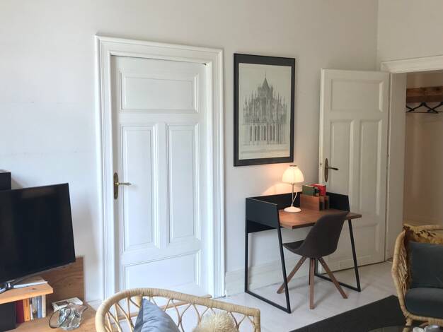 Die Zwei-Zimmerwohnung befindet sich im Erdgeschoss eines Stilaltbaus aus dem Jahre 1910. Die Fassade wurde 2014 liebevoll und detailgetreu saniert. Durch einen kleinen Flur gelangt man in Wohnzimmer...