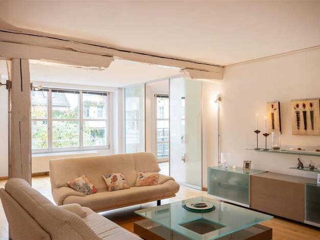 Diese Maisonettewohnung erstreckt sich über zwei Ebenen und bietet ein besonderes Wohngefühl mit klar getrennten Wohnbereichen. Der Blick über die Dächer von Fürth verleiht der Wohnung eine offene, u...