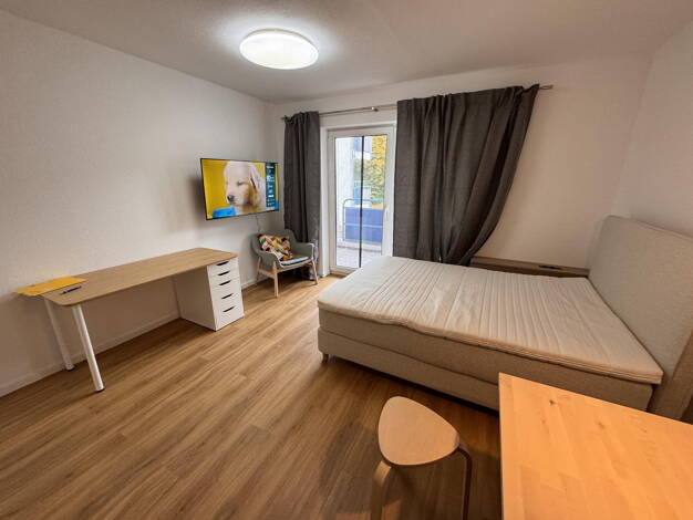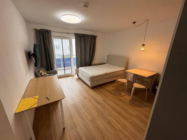 Die Wohnung ist renoviert. Neues Bad und Fußboden und wird teil möbliert vermietet. Zur Möblierung gehört ein Bett, Schreibtisch, Stuhl, Schrank, Garderobe, Badezimmerschrank sowie eine Pantry Küche mit Kühlschrank, zwei Herdplatten und Hängeschrank . Die Wohnung liegt in einem Mehrparteienhaus in der 1. Etage. Neben dreifach isolierten Fenster mit Balkontür gehört auch ein sehr schöner Balkon bzw. Loggia und ein abschließbares Kellerabteil als Abstellraum(ca. 4 qm²) dazu. Es gibt einen Waschma...