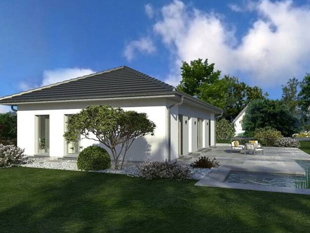Unser Bungalow 1 Walmdach bietet auf einer Wohnfläche von 107 m² alles, was die Kleinfamilie zum Wohnen und Wohlfühlen benötigt. Das kombinierte Wohn-Ess-Zimmer ist großzügig geschnitten und dank dre...