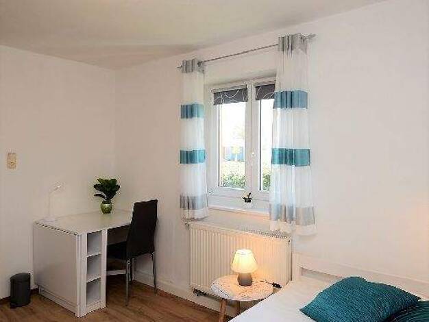 Diese 2021 neu möblierte Wohnung liegt in Thierhaupten, ca. 20 Autominuten von Augsburg entfernt. Sie verfügt über einen eigenen Eingang über eine Außentreppe und ist aufgeteilt in einen Eingangsbereich mit Garderobe, ein Schlafzimmer mit Doppelbett bestehen aus zwei Einzelbetten und Kleiderschrank, ein gemütliches Wohnzimmer, eine Wohnküche mit Essplatz für bis zu 4 Personen, ein zweites Schlafzimmer mit 140er Doppelbett, ein Duschbad mit Fenster und eine separate Toilette. Die Wohnung eignet ...