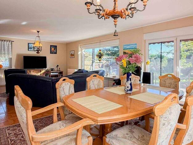 Das Einfamilienhaus wurde 1993 in massiver Bauweise errichtet. Im Erdgeschoss befinden sich zur Zeit die gemütliche Küche, ein Hauswirtschaftsraum mit Heizungsraum, ein Schlafzimmer sowie das Wohnzim...