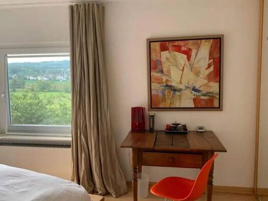Modern möblierte 2,5-Zimmer Wohnung mit Terrasse, Balkon mit toller Aussicht, Garten und Internet in ruhiger Ortsrandlage in einem 3-Familienhaus in Leonberg-Warmbronn. Der Wohn- und Essbereich mit Z...