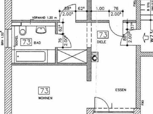 Die Wohnung ist aufgeteilt in Flur, einen großzügigen Wohn- und Essbereich mit Zugang zur Loggia, Schlafzimmer, Küche und Bad. Das Tageslichtbad verfügt über eine Badewanne. Der Wohn- und Schlafberei...