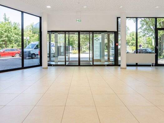 Besucher betreten das moderne Gebäude durch eine repräsentative Lobby. Hohe Glasflächen und hochwertige Materialien schaffen eine freundliche Atmosphäre, die sich in allen Bereichen des Hauses fortse...