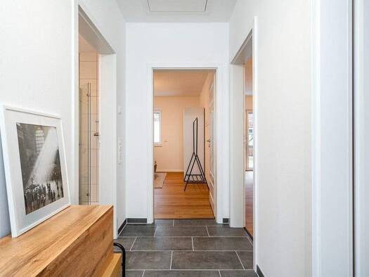 Diese moderne Doppelhaushälfte in massiver Bauweise (Baujahr 2025) verbindet zeitgemäßen Wohnkomfort mit einer besonders angenehmen Lage: Der freie, unverbaubare Blick über die Felder schafft ein ruh...