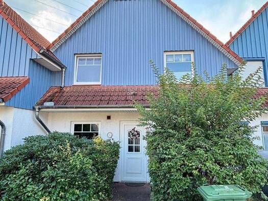 Hübsches Reihenhaus (Massivhaus): 1 Außen-Stellplatz direkt vor dem Haus (im Preis enthalten). NEU in 2020 ! Gas-Brennwert-Therme. Weißer Außenputz mit attraktiver blauer Holzfassade im oberen Bereic...