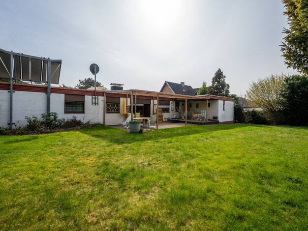 Dieser großzügige Bungalow aus dem Baujahr 1963 bietet auf ca. 160 m² Wohnfläche komfortables Wohnen auf einer Ebene und überzeugt durch eine durchdachte Raumaufteilung. Der helle Wohn- und Essbereic...