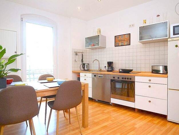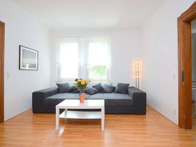 Ideal für 2 Kollegen oder eine Familie: Modern möblierte 3-Zimmer-Wohnung mit WLAN und Balkon in einem gepflegten Mehrfamilienhaus in Nürnberg/Lichtenhof ideal zur Bundesagentur für Arbeit. Die Möblierung des Wohnzimmers besteht aus einer Couch, Couchtisch, Sideboard mit Flatscreen TV und einem weiteren Regal. Das 1. Schlafzimmer ist eingerichtet mit einem Doppelbett (1,80x2,00 m), Holzkleiderschrank und einem Tisch. Das 2. Schlafzimmer hat ein Doppelbett (1,80x2,00 m), Nachtkästchen, Kleidersc...