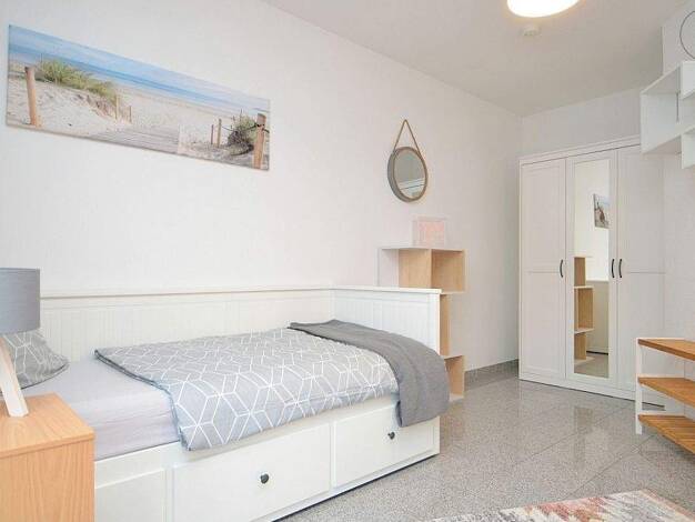 Ideal zum Hauptbahnhof und Bundesagentur für Arbeit: Modern und geschmackvoll möbliertes 1-Zimmer-Apartment mit WLAN, Balkon und Tiefgaragenstellplatz in einem gepflegten Mehrfamilienhaus in Nürnberg/St.-Peter. Die Möblierung des Zimmers besteht aus einem ausziehbaren Einzelbett (0,90x2,00 m bzw. 1,80x2,00 m), Nachtkästchen, Regal, 3-türigen Kleiderschrank, Hocker Flatscreen TV sowie einem Esstisch mit 2 Stühlen. Der angrenzende Balkon mit Tisch und Stühlen lädt zum Verweilen ein. Die separate ...