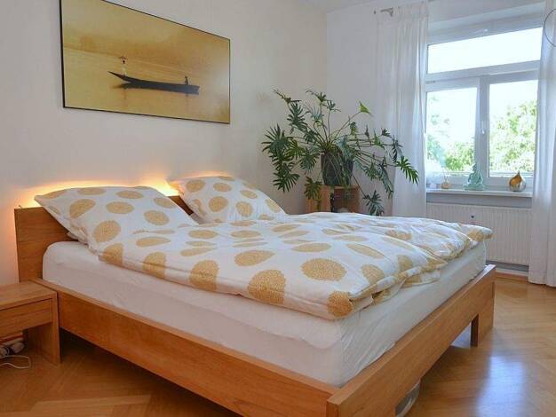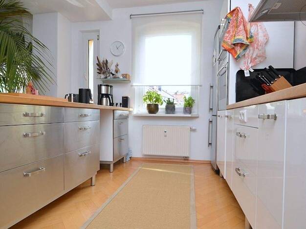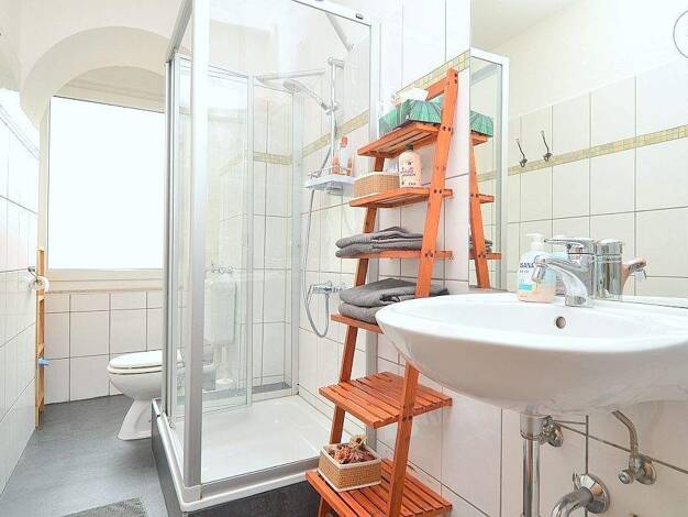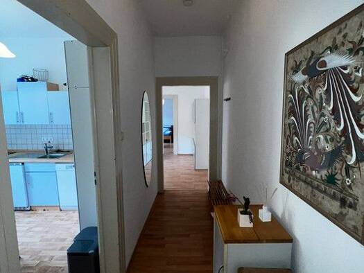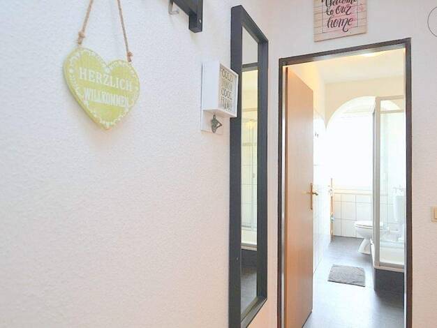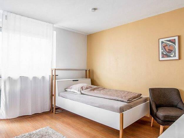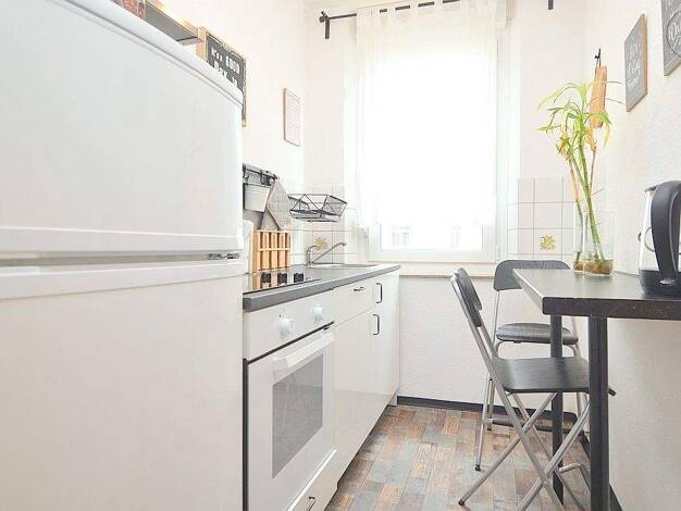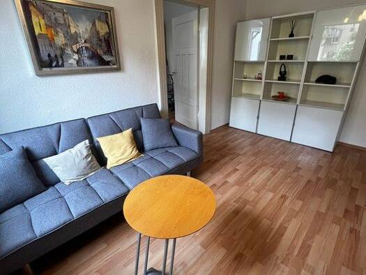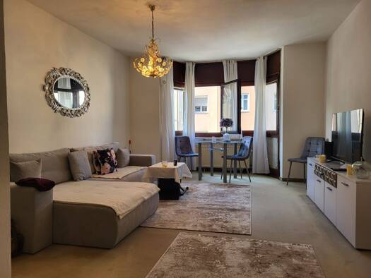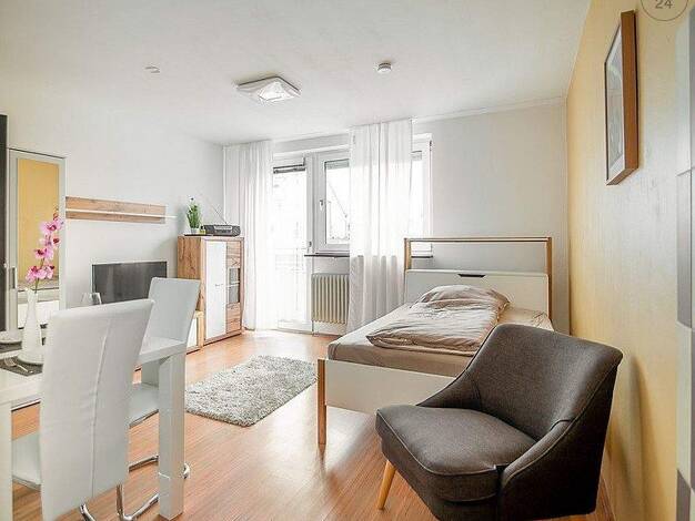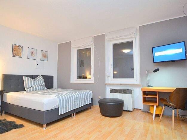 Ideal zum Hauptbahnhof: Schön möbliertes 1-Zimmer-Apartment mit WLAN in Nürnberg/Steinbühl. Die Möblierung des Zimmers besteht aus 2 Einzelbetten, die man als Doppelbett nutzen kann (2x 0,90x2,00 m), Nachttisch, Flatscreen TV, ausziehbare Schlafcouch, Hocker, Couchtisch sowie einem Schreibtisch mit Stuhl. Die separate Küche ist mit allen Utensilien des täglichen Bedarfs ausgestattet wie Herd, Backofen, Kochutensilien, freihstehendem Kühlschrank, Kaffeemaschine, Wasserkocher etc. Ein Hochtisch m...