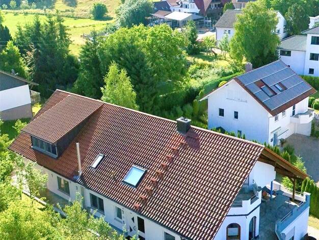 Herzlich Willkommen! Das attraktive, sehr gepflegte Architektenhaus wurde im Jahr 1994 in einer idyllischen Wohnlage erbaut. Der Anbau mit den Garagen und dem Appartement erfolgte 2016. Die offene Ba...