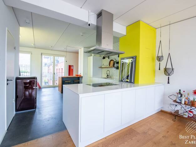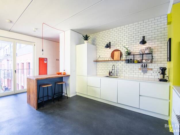 Das Penthouse verbindet klare Architektur mit einer Lage am Schnittpunkt von Mitte und Kreuzberg. Sichtbeton, freigelegte Ziegel und Stahl-Glas-Elemente prägen den offenen Grundriss und geben der Woh...