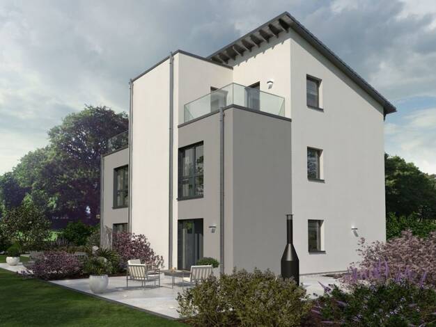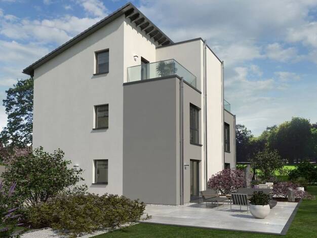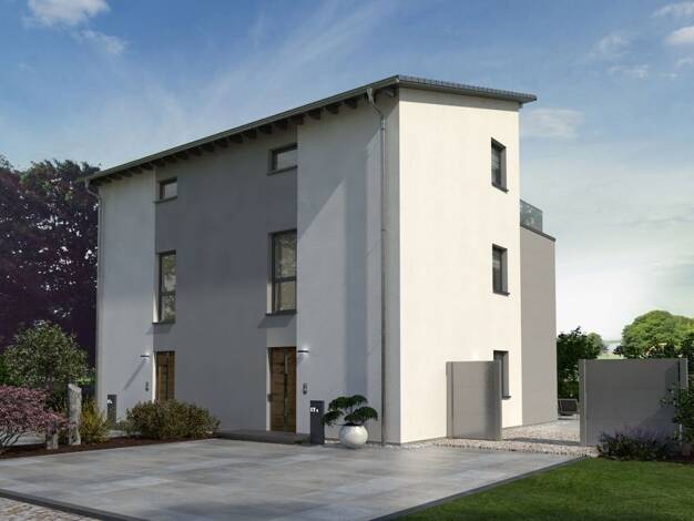 Unsere elegante Stadtvilla mit Pyramidendach besticht durch mediterrane Leichtigkeit und flexible Wohnraumnutzung. Während die Bauherren eine Ebene selbst bewohnen, bietet die zweite Platz für Eltern...