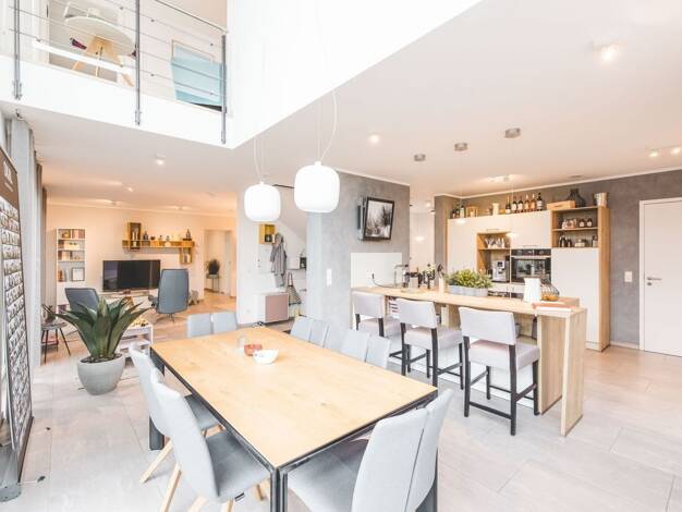 Zwei volle Geschosse mit Flachdach - ein echtes Raumwunder und von außen schon ein Hingucker, so präsentiert sich unsere Doppelhaushälfte Double 8. Im Erdgeschoss tragen viele bodentiefe Fenster dazu...