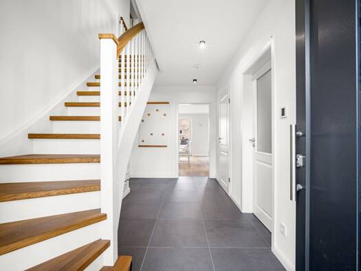 Klassisch und stilvoll präsentiert sich dieses 2-geschossige Einfamilienhaus. Unter dem Satteldach vereinen sich moderne Architektur und höchster Wohnkomfort. Im Entrée trennt die offene Treppe WC un...