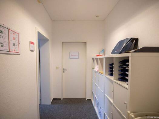 Die Bürofläche, erbaut im Jahr 1983, bietet eine repräsentative Fassade mit rotem Klinker und liegt in einer attraktiven Umgebung mit Wohnbebauung, Praxen und Büros im näheren Umfeld. Der Eingangsber...