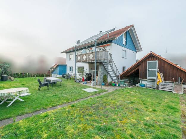 Diese großzügige 5-Zimmer-Eigentumswohnung liegt im Erdgeschoss eines Zweifamilienhauses aus dem Baujahr 1969 und bietet mit ca. 151 m² Wohnfläche viel Raum für individuelles Wohnen im ländlichen Umf...