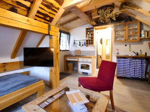 Wunderschöne, sonnige und stilvoll möblierte 1,5 Zimmer Loftwohnung mit tollem Dachaustritt (VELUX CABRIO) und schönem Blick auf die Weinberge in Stuttgart Uhlbach. Die Dachgeschosswohnung mit schönen Edelharzboden wurde hochwertig und liebevoll ausgebaut und bietet einen tollen Blick auf die Weinberge und die Grabkapelle auf dem Württemberg. Der Wohn- und Essbereich ist mit einem Ecksofa, einem Regal, einem Sideboard mit Flat-TV und einem Esstisch mit drei Stühlen eingerichtet. Hier befindet s...